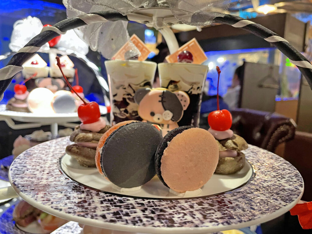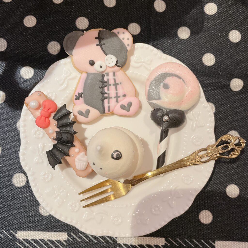 テディベアのアイシングクッキー、ピンクと黒のマカロン