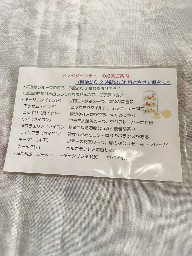 アフタヌーンティーを頼むと、グループで3種類紅茶が選べます。